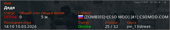 Играет на Counter Strike 1.6 сервере. Страна: РоссияПервый раз замечен 13:49 10.03.2026