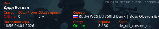Играет на Counter Strike Global Offensive сервере. Страна: РоссияПервый раз замечен 16:54 04.04.2026