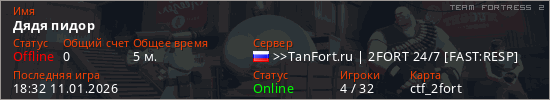 Играет на Team Fortress 2 сервере. Страна: РоссияПервый раз замечен 18:26 11.01.2026