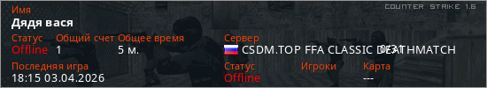 Играет на Counter Strike 1.6 сервере. Страна: РоссияПервый раз замечен 18:02 03.04.2026