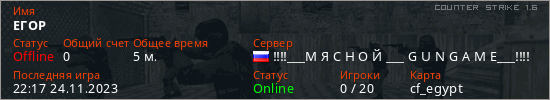 Играет на Counter Strike 1.6 сервере. Страна: РоссияПервый раз замечен 22:15 24.11.2023