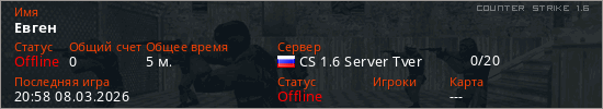 Играет на Counter Strike 1.6 сервере. Страна: РоссияПервый раз замечен 20:56 08.03.2026