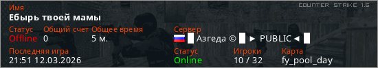 Играет на Counter Strike 1.6 сервере. Страна: РоссияПервый раз замечен 21:15 12.03.2026