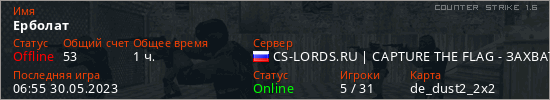 Играет на Counter Strike 1.6 сервере. Страна: РоссияПервый раз замечен 13:30 14.01.2023