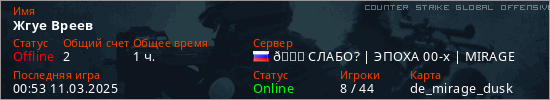 Играет на Counter Strike Global Offensive сервере. Страна: РоссияПервый раз замечен 22:58 10.03.2025