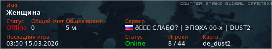 Играет на Counter Strike Global Offensive сервере. Страна: РоссияПервый раз замечен 03:39 15.03.2026