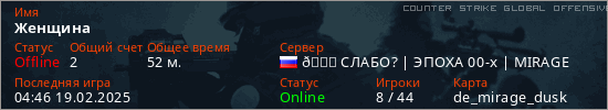 Играет на Counter Strike Global Offensive сервере. Страна: РоссияПервый раз замечен 22:37 22.05.2024