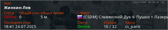 Играет на Counter Strike 1.6 сервере. Страна: РоссияПервый раз замечен 18:39 24.07.2025