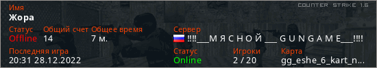 Играет на Counter Strike 1.6 сервере. Страна: РоссияПервый раз замечен 20:27 28.12.2022