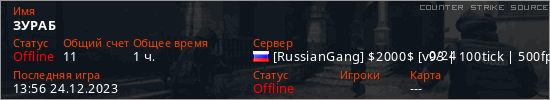 Играет на Counter Strike Source сервере. Страна: РоссияПервый раз замечен 19:29 10.10.2023