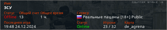 Играет на Counter Strike 1.6 сервере. Страна: РоссияПервый раз замечен 23:38 06.01.2023