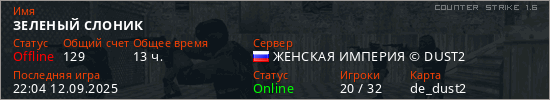 Играет на Counter Strike 1.6 сервере. Страна: РоссияПервый раз замечен 08:00 22.07.2025