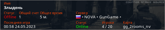 Играет на Counter Strike Source сервере. Страна: РоссияПервый раз замечен 00:32 24.05.2023