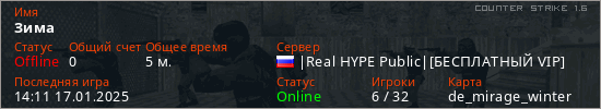 Играет на Counter Strike 1.6 сервере. Страна: РоссияПервый раз замечен 14:07 17.01.2025