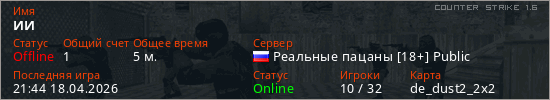Играет на Counter Strike 1.6 сервере. Страна: РоссияПервый раз замечен 21:40 18.04.2026