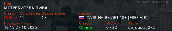 Играет на Counter Strike 1.6 сервере. Страна: РоссияПервый раз замечен 11:56 26.10.2025