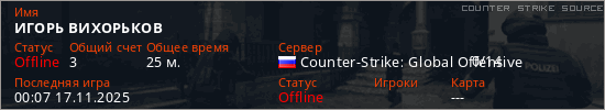 Играет на Counter Strike Source сервере. Страна: РоссияПервый раз замечен 13:51 30.10.2025
