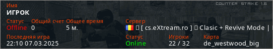 Играет на Counter Strike 1.6 сервере. Страна: РумынияПервый раз замечен 22:08 07.03.2025