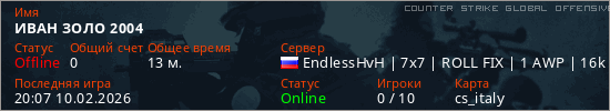 Играет на Counter Strike Global Offensive сервере. Страна: РоссияПервый раз замечен 17:50 09.02.2026