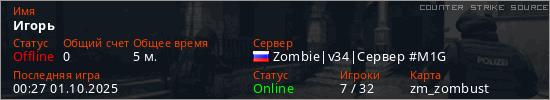 Играет на Counter Strike Source сервере. Страна: РоссияПервый раз замечен 00:25 01.10.2025