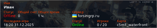 Играет на Left 4 Dead 2 сервере. Страна: УкраинаПервый раз замечен 11:37 28.12.2025