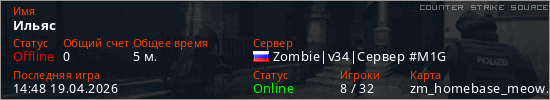 Играет на Counter Strike Source сервере. Страна: РоссияПервый раз замечен 14:46 19.04.2026