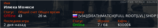 Играет на Counter Strike Source сервере. Страна: РоссияПервый раз замечен 21:02 16.01.2026