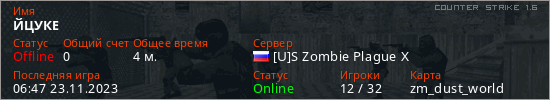 Играет на Counter Strike 1.6 сервере. Страна: РоссияПервый раз замечен 06:39 23.11.2023