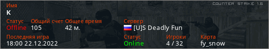 Играет на Counter Strike 1.6 сервере. Страна: РоссияПервый раз замечен 17:21 22.12.2022