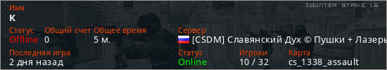 Играет на Counter Strike 1.6 сервере. Страна: РоссияПервый раз замечен 16:25 22.03.2026