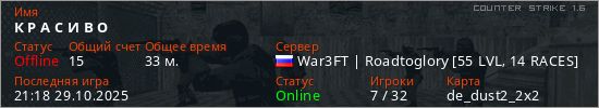 Играет на Counter Strike 1.6 сервере. Страна: РоссияПервый раз замечен 14:53 13.10.2024