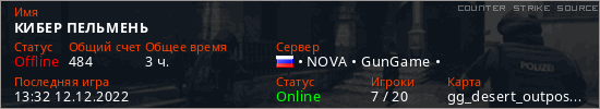 Играет на Counter Strike Source сервере. Страна: РоссияПервый раз замечен 10:23 08.12.2022
