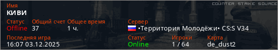 Играет на Counter Strike Source сервере. Страна: РоссияПервый раз замечен 16:53 10.11.2025