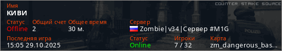 Играет на Counter Strike Source сервере. Страна: РоссияПервый раз замечен 23:56 28.08.2025