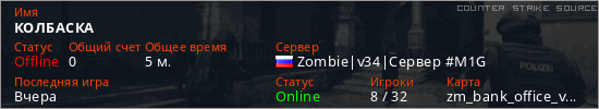 Играет на Counter Strike Source сервере. Страна: РоссияПервый раз замечен 08:44 31.03.2026
