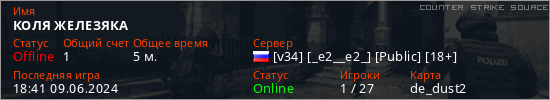 Играет на Counter Strike Source сервере. Страна: РоссияПервый раз замечен 18:12 09.06.2024