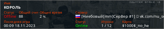 Последний раз был в сети 00:09 18.11.2023 Игрок с таким ником замечен на 24 серверах