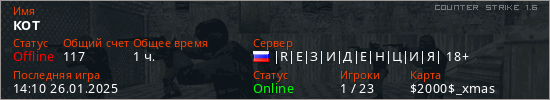 Играет на Counter Strike 1.6 сервере. Страна: РоссияПервый раз замечен 19:47 04.03.2022