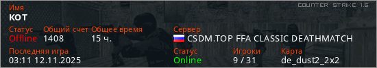 Играет на Counter Strike 1.6 сервере. Страна: РоссияПервый раз замечен 17:50 10.11.2019