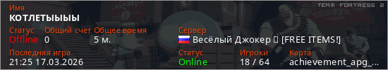 Играет на Team Fortress 2 сервере. Страна: РоссияПервый раз замечен 21:16 17.03.2026
