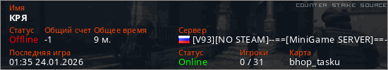 Играет на Counter Strike Source сервере. Страна: РоссияПервый раз замечен 01:05 24.01.2026