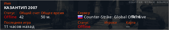 Играет на Counter Strike Source сервере. Страна: РоссияПервый раз замечен 16:29 03.09.2025