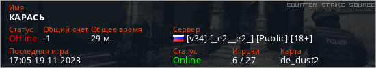 Играет на Counter Strike Source сервере. Страна: РоссияПервый раз замечен 17:06 13.11.2023