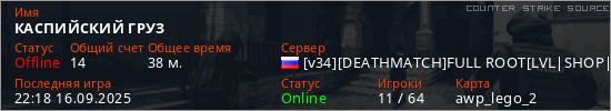 Играет на Counter Strike Source сервере. Страна: РоссияПервый раз замечен 22:31 17.07.2025