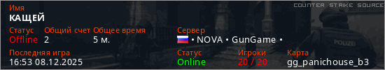 Играет на Counter Strike Source сервере. Страна: РоссияПервый раз замечен 16:49 08.12.2025