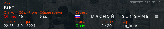 Играет на Counter Strike 1.6 сервере. Страна: РоссияПервый раз замечен 19:12 12.01.2024
