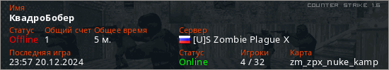 Играет на Counter Strike 1.6 сервере. Страна: РоссияПервый раз замечен 23:57 20.12.2024