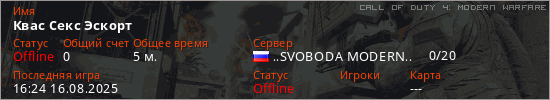 Играет на Call of Duty 4: Modern Warfare сервере. Страна: РоссияПервый раз замечен 15:14 16.08.2025