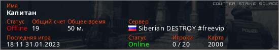 Играет на Counter Strike Source сервере. Страна: РоссияПервый раз замечен 17:05 27.01.2023