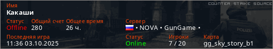 Играет на Counter Strike Source сервере. Страна: РоссияПервый раз замечен 08:12 19.07.2023